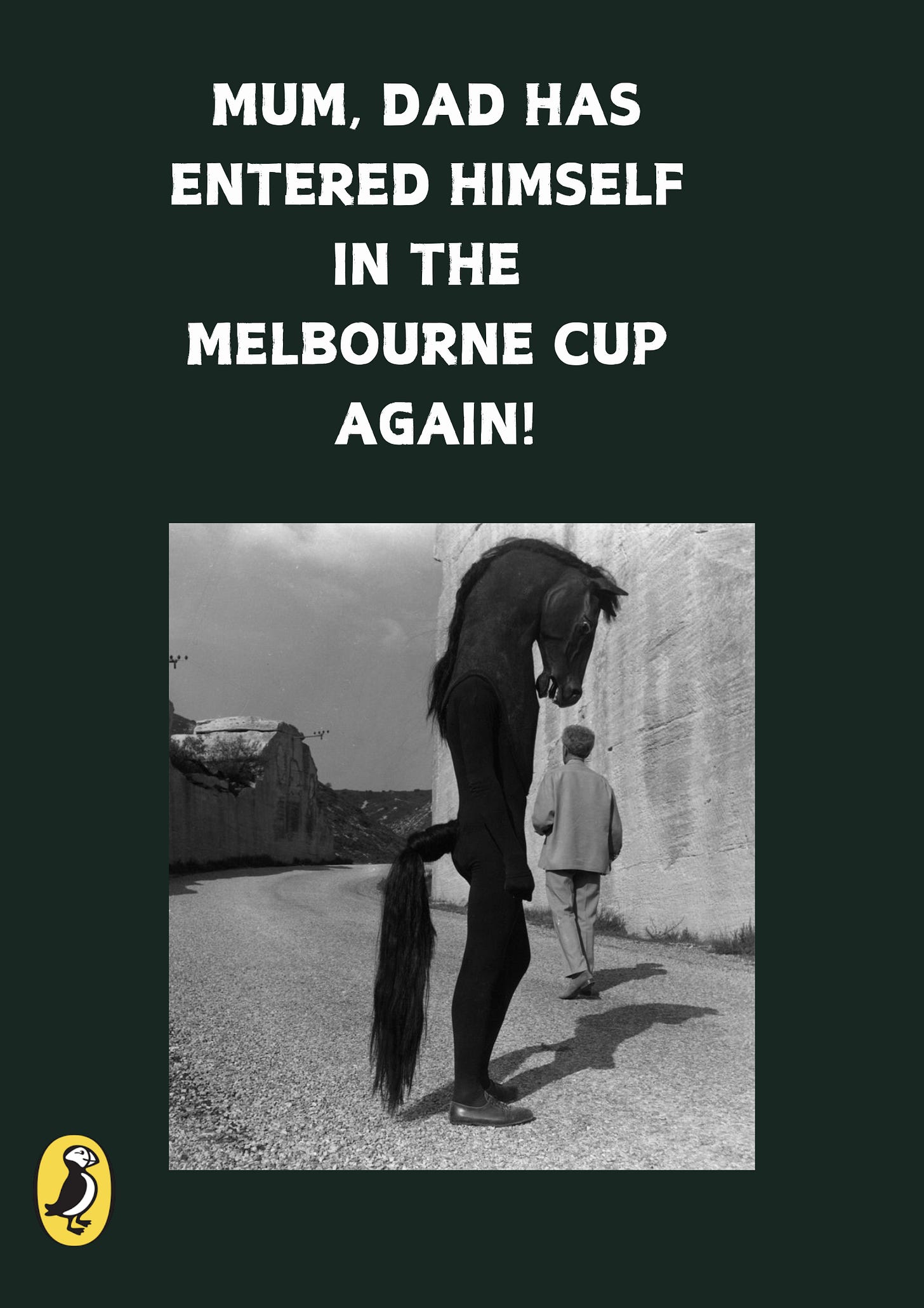 ‘Mum, Dad has entered himself in the Melbourne Cup again!’ I called out from the kitchen window as I watched dad give Uncle Barry a piggy back around the backyard. He was dressed in jockey silks and dad whinnied with every strike of his whip.
