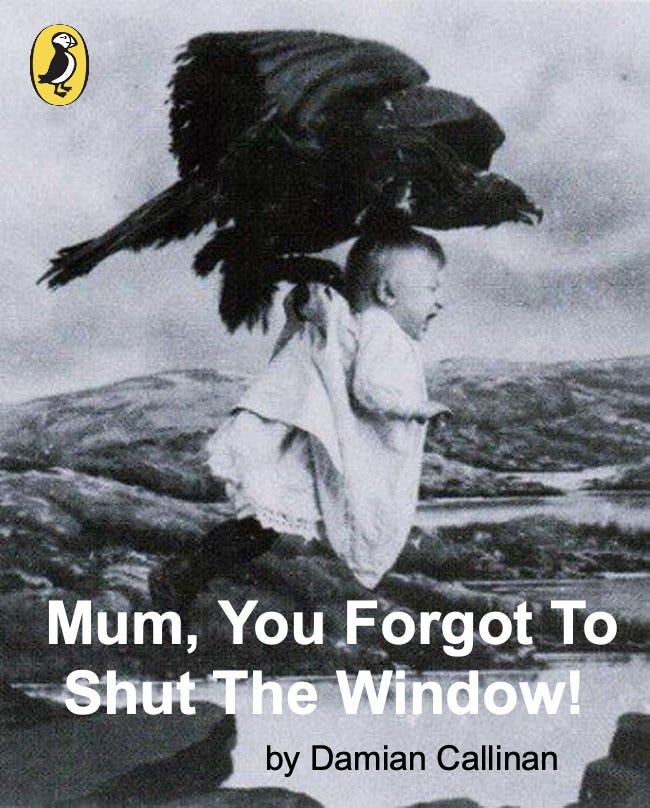 Let’s examine the above book jacket by way of example. ‘Mum, You Forgot To Shut The Window’ doesn’t bear further examination within the acceptable and responsible realms of children’s literature. Even assuming the protagonist’s younger sibling survives, by page 3 the cops are involved. By page 5 the social workers have stepped in and half way down page 8, the protagonist and the baby have been removed from the family home, pending a family court hearing.